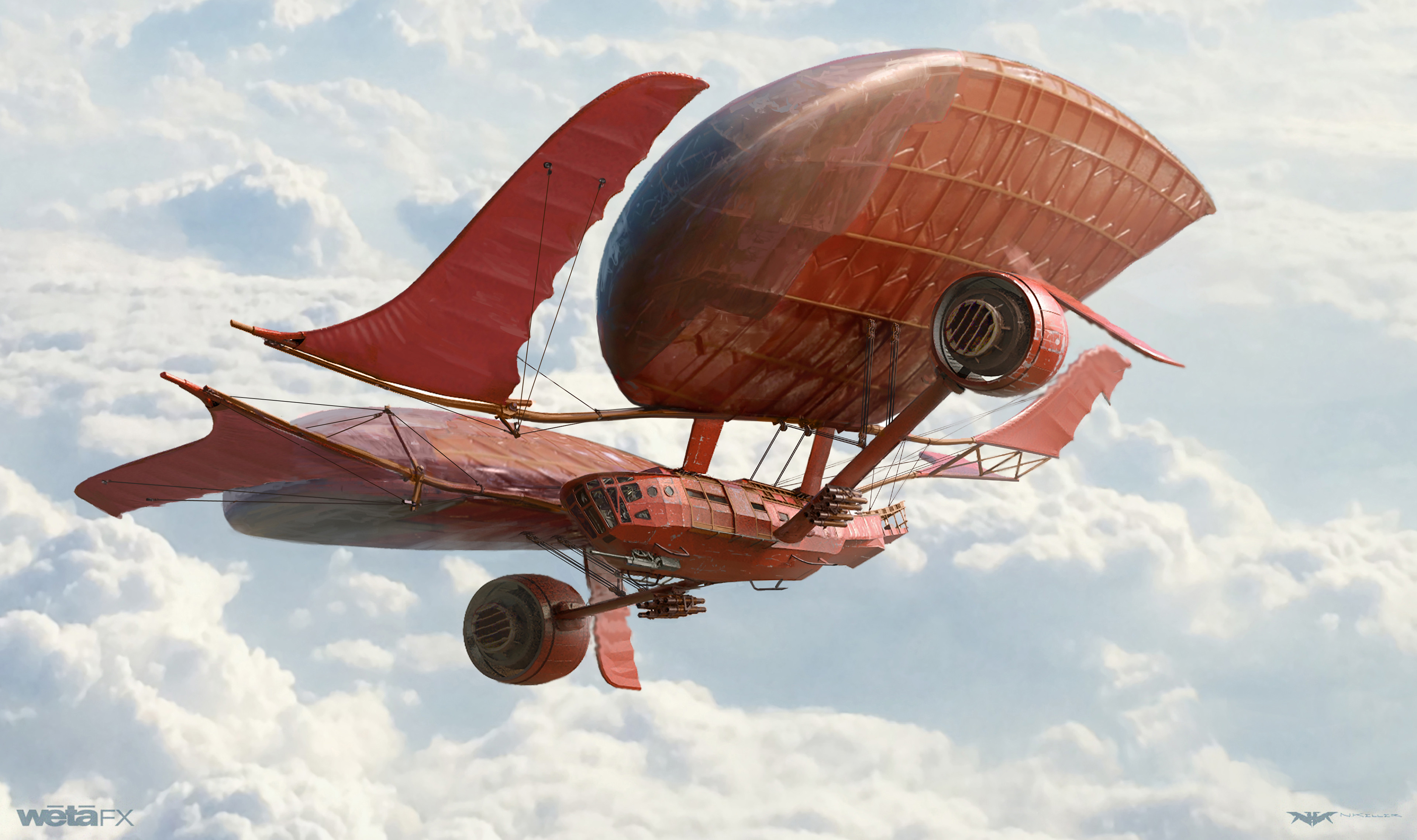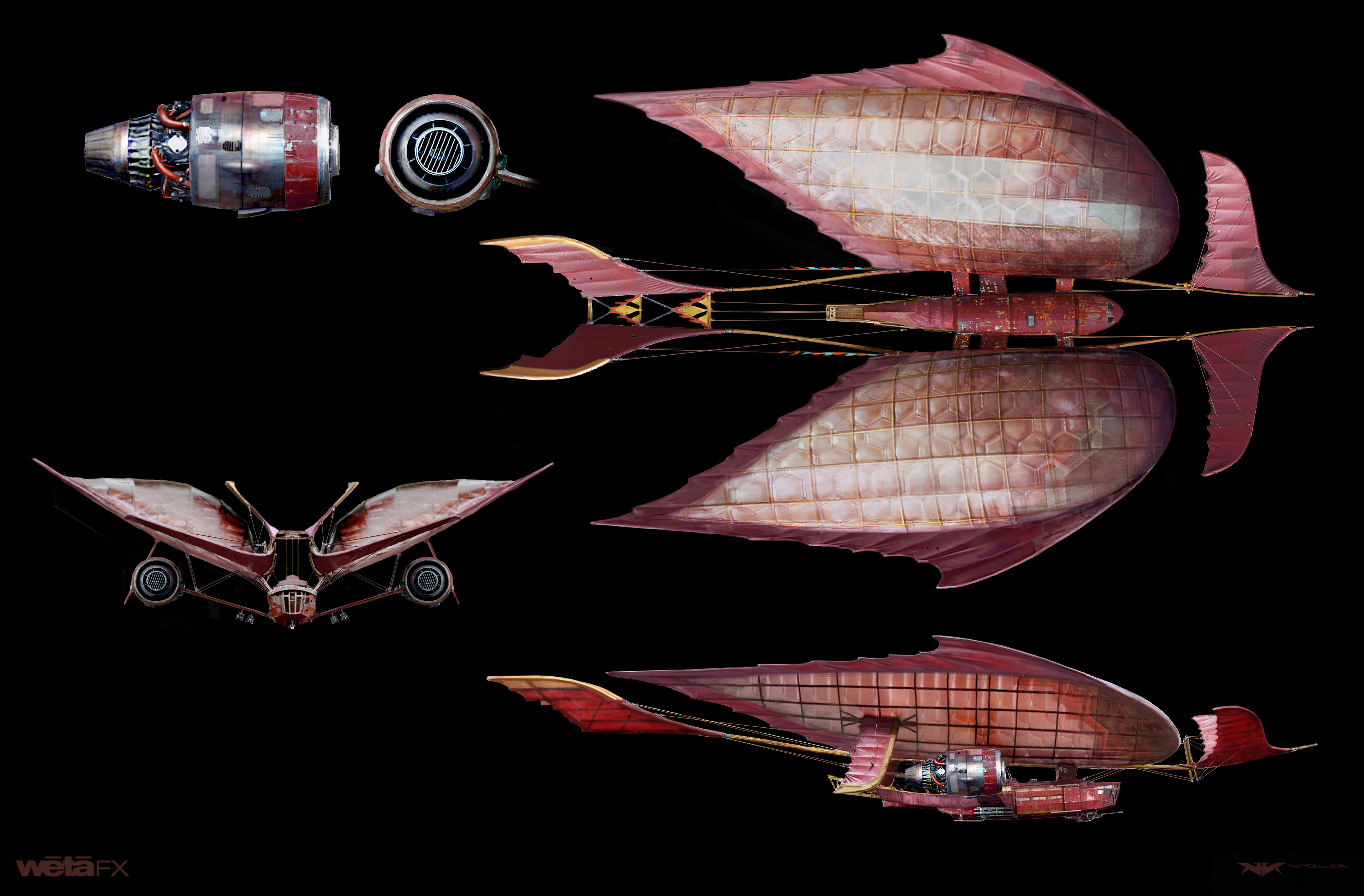 Anna Fang's airship the Jenny Haniver went through a lengthy design arc settling on something quite unconventional. The shape language of dual teardrop envelopes and multiple fin-like control surfaces ended up taking on an almost sea creature-like aesthetic as a nod to the ship's namesake. The physical set comprising the gondola/cockpit was a beautiful build, amazing effort by all involved.